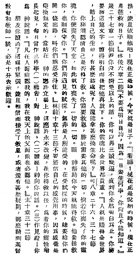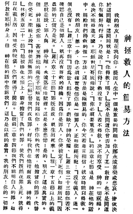 生死存亡的大事朋友!我要问你人生中最最重要的问题,它是与你永远的喜乐或悲伤紧密相连的。这个问题就是:“你得救了吗?” 这不是问你有没有行善,也不是问你有没有加入教会,而是问你有没有得救,也就是问你能不能肯定,你死了以后一定会上天堂。 真神耶稣在圣经的约翰福音3:7中说,为了能上天堂,“你们必须重生。” 圣经把使人得救的方法告诉我们,让我们知道如何重生和得救。神的方法很简单,你现在就可以得救。你愿意吗? 朋友!首先,你必须认识到你是个罪人。(圣经里讲的罪比中国人理解的罪意义更为广泛,它不但包含了人的刑事罪,也包含了一切达不到神标准的人的意念和行为)罗马书3:23说:“世人都犯了罪,亏缺了神的荣耀。” 因为你是个罪人,所以完全圣洁的神判了你死刑。罗马书6:23说:“罪的工价乃是死。” 这包括了在地狱里与神永远隔绝,受永火的刑罚。 希伯来书9:27说:“按着定命,人人都有一死,死后且有审判。” 然而神却非常爱你,他甚至把自己的独生爱子耶稣基督都赐给了你,使他担当你的罪,替你死。 哥林多后书5:21说:“神使那无罪的(耶稣)替我们成为罪,好叫我们在他里面成为神的义。”