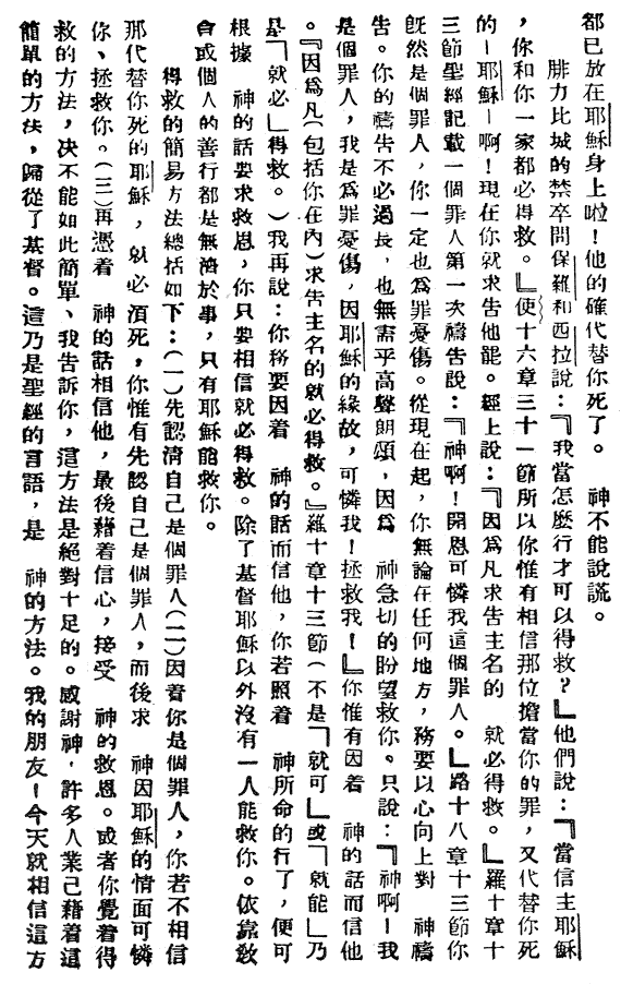 耶稣为我们流血而死,因“活物的生命是在血中。”(利未记17:11)所以 “惟有基督在我们还作罪人的时候为我们死,神的爱就在此向我们显明了。”(罗马书5:8)虽然我们无法理解,神如何把我们的罪放在那完全无罪的耶稣身上,让耶稣替我们死;然而耶稣的确替我们死了,这是真的,因为神绝不会撒谎。 朋友!现在“神…吩咐各处的人都要悔改”(使徒行传17:30)。这个悔改就是要求我们在思想意念上来个根本转变,同意神的看法:我们都是罪人,而耶稣为我们的罪钉死在十字架上。 腓立比城的禁卒问保罗和西拉说:“‘我当怎样行才可以得救?’他们说:‘当信主耶稣,你…必得救.’”(使徒行传16:31) 所以你只有相信那位担当你的罪,替你死而埋葬,神使他从死里复活的耶稣,才能得救.凡接受耶稣为救主的人,耶稣复活的大能,就能确保他获得永生。约翰福音1:12说:“凡接待他的,就是信他名的人,他就赐他们权柄,作神的儿女.”。罗马书1:13说:“凡求告主名的,就必得救.” 这个“凡”就包括了你。“就必得救”的意思不是“可能”或“就能”得救,而是“必定得救”。 你需要认清自己是个罪人,不管你在哪里,你现在就应当立即悔改,通过祷告,把你的心交托给神。 在路加福音18:13中,有个罪人向神祷告说:“神啊,开恩可怜我这个罪人!”你也需要效法他作这样的祷告:“神啊,我知道我是个罪人。我信耶稣替我死在十字架上,我信耶稣为我流血、受死、埋葬和复活。我现在愿意接受他作我的救主。我感谢你赦免了我的罪,赐给我救恩和永生。阿们。” 你只有借着对神话语和救恩的信心才能得救。除此之外,任何教会或善行等都不能救你。神已完成了救恩的全部工作,只需要我们去信靠他,接受他的救恩就够了。 神救人的简易方案可概括如下:你是个罪人,你若不肯信耶稣,信他为你的罪而死,你就只有在地狱里受永火刑罚的痛苦。你若信耶稣为你钉十字架、埋葬、复活,信耶稣是你的救主,你的罪就都会得到神的赦免,凭信心得到了神所赐的礼物---永远的救恩,即永生。 可能你会说:“得救绝不会如此简单。” 可是实际上就是如此简单,因为圣经对这个问题讲得很清楚,这就是神的计划。朋友!请你现在就相信并接受耶稣作你的救主。如果你对上面的话还不十分明白,希望你能够多读几遍这个福音单张,直到你能够完全明白为止。你的灵魂比全世界都宝贵。“人就是赚得全世界,赔上自己的生命,有什么益处呢?人还能拿什么换生命呢?”(马可福音8:36-37)你需要肯定自己是否已经得救,如果你的灵魂失丧,上不了天堂,你就失去了一切。愿神使你现在就得救。神有能力救你,也有能力保守你,使你过得胜的生活。“你们所遇见的试探,无非是人所能受的,…在受试探的时候,总要给你们开一条出路,叫你们能忍受得住。”(哥林多前书10:13)不要凭自己的感觉定是非,因感觉是变换无定的,我们必须站在神的应许上。神的应许是永不改变的。在你得救以后,为了使你灵性长进,你每天应当作三件事:(1)祷告---你对神说话。(2)读圣经---神向你说话。(3)作见证---你为神说话。 你需要毫不迟延地听从主耶稣基督的命令去施浸礼,公开见证你的救恩,然后加入一个信仰圣经的教会。“你不要以给我们的主作见证为耻”(提摩太后书1:8)。 “凡在人面前认我的,我在我天上的父面前也必认他。”(马太福音10:32) 下面再列举一些圣经经文,供你参考。相信对于你的信仰一定会大有帮助的:约翰福音3:16;彼得前书2:24;以赛亚书53:6;雅各书1:15;罗马书10:9-10;以弗所书2:8-9);箴言27:1;哥林多前书15:3-4;约翰福音10:27-30;约翰一书5:13。